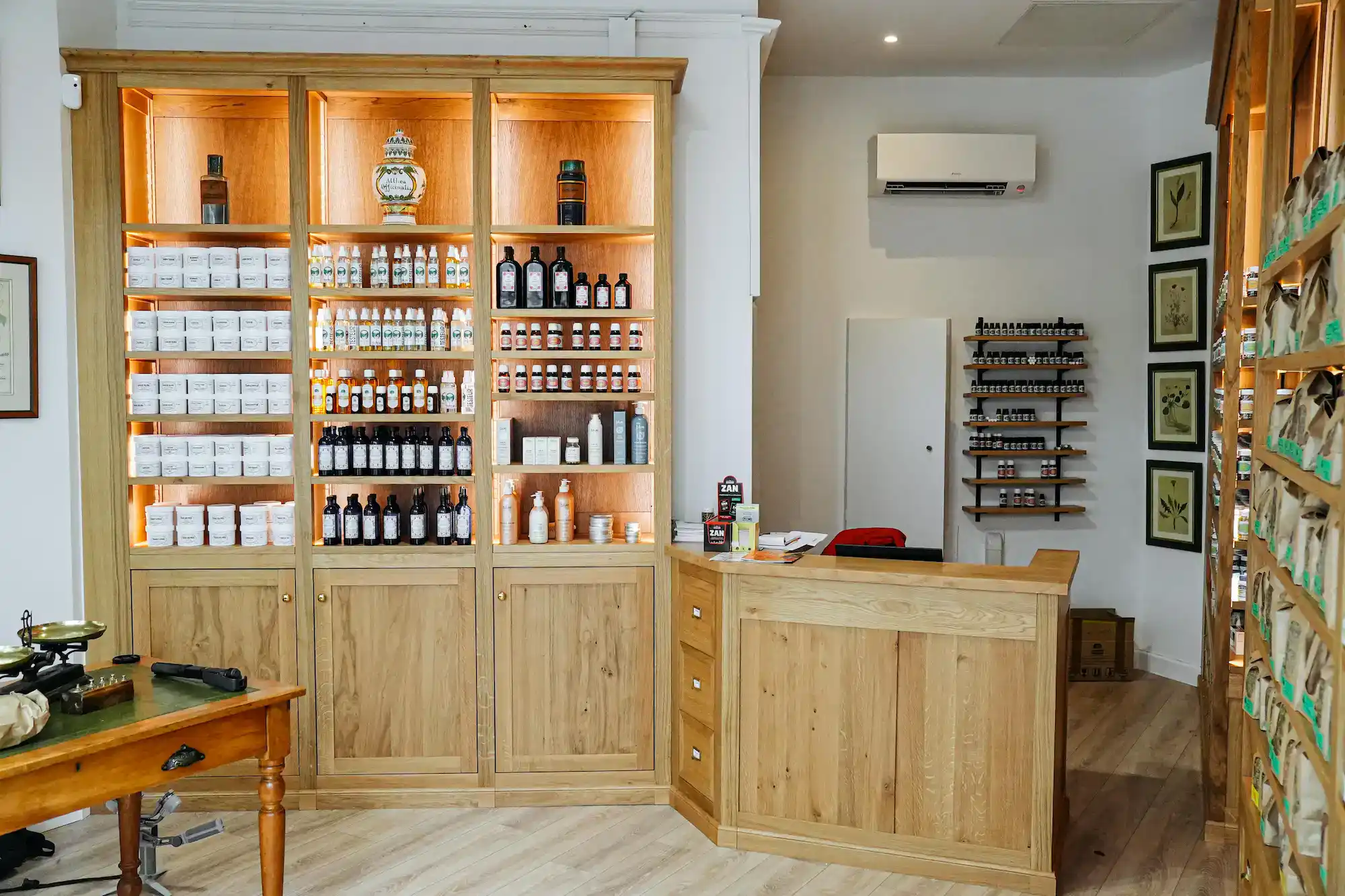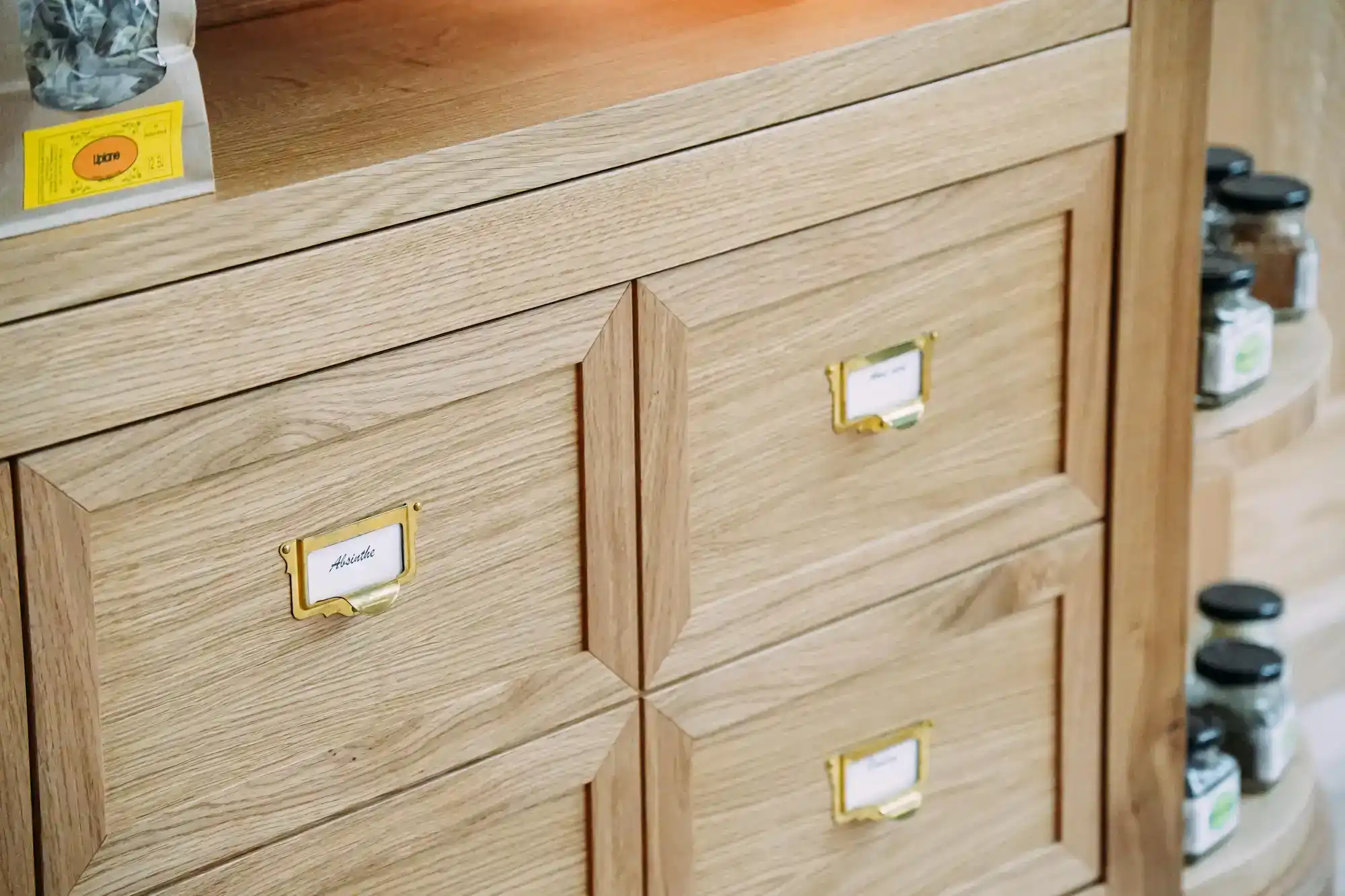 Un agencement pensé pour sublimer plantes médicinales, tisanes et élixirs, avec rangements auto-éclairés, tiroirs étiquetés et finitions soignées.