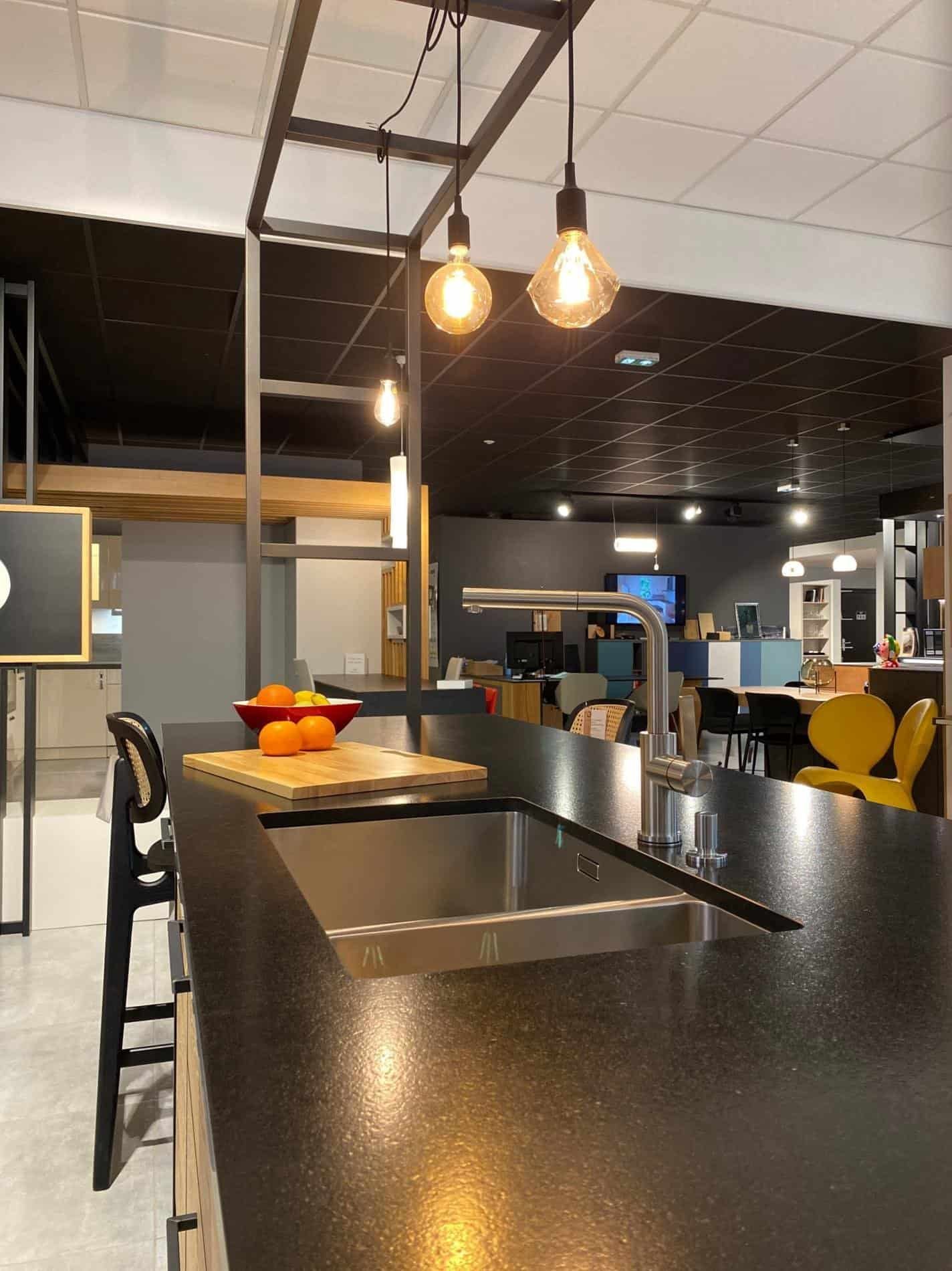 -un îlot de L328 x P100 cm avec l’évier Blanco 500/180 U et le lave-vaisselle Neff S723P60X0, puis un plan snack pour deux personnes. L’encombrement total de l’îlot, avec les niches décoratives, est de L328 x P150 cm.