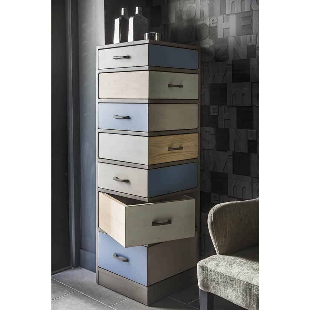 Façades tiroirs alternée perle / jean délavé/ merisier naturel / gris vernis mat