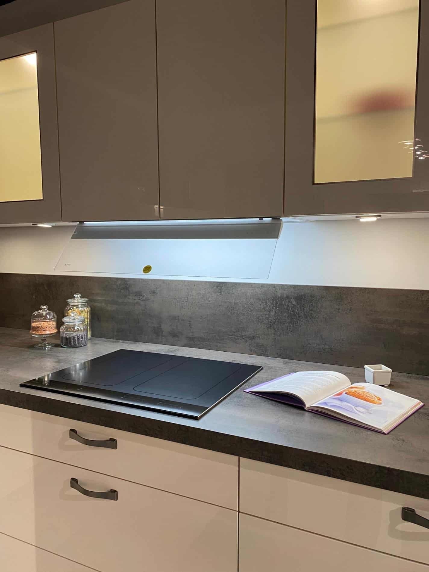-un linéaire de L246 x P65 cm avec des meubles bas et des meubles hauts, la plaque de cuisson induction Asko HI1655M, et une hotte Novy 786 avec un clapet transparent et intégrée dans le meuble haut.